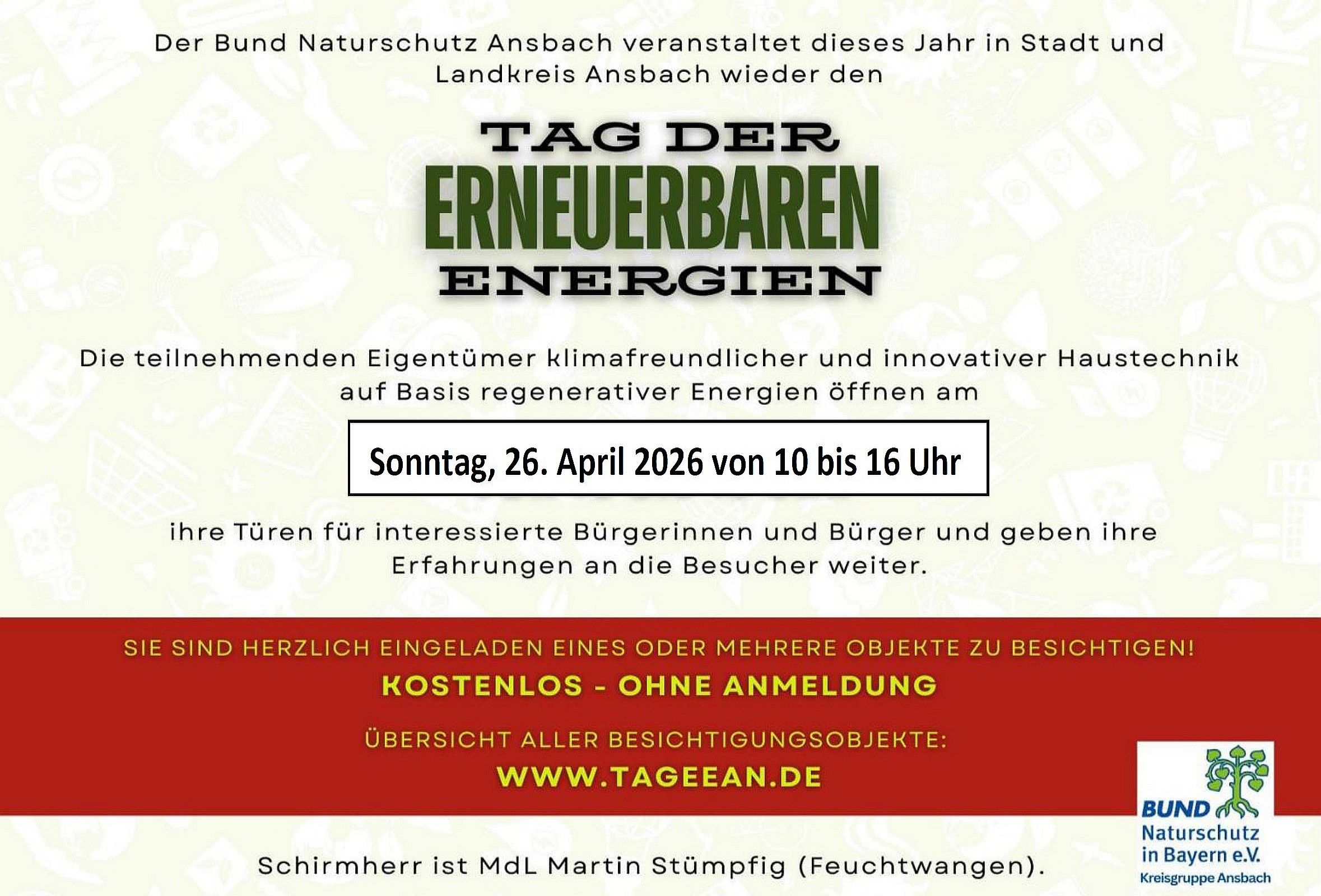 wieder den „Tag der erneuerbaren Energien“ in Stadt und Landkreis Ansbach, Schirmherr ist MdL Martin Stümpfig aus Feuchtwangen.